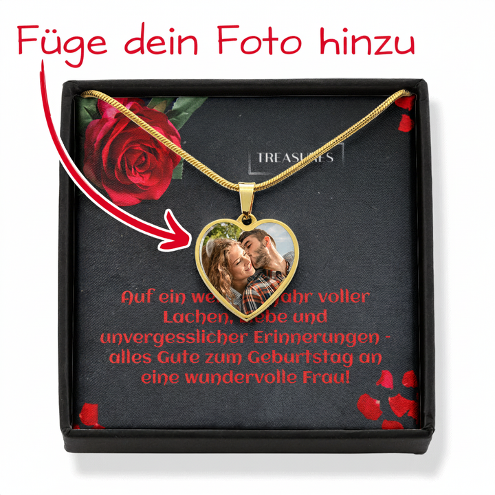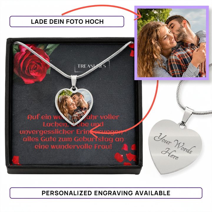 Mache ihren Geburtstag unvergesslich mit einem Geschenk, das so einzigartig ist wie eure Verbindung. Diese wunderschöne Foto-Herz-Kette ist das ideale Erinnerungsstück – ob für deine Ehefrau, beste Freundin oder eine ganz besondere Frau in deinem Leben.➜ Lade das perfekte Foto von geliebten Menschen, Freunden oder sogar dem Haustier hoch und kreiere ein Schmuckstück, das wirklich einzigartig ist.